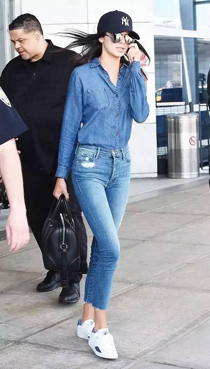 金小妹Kendall Jenner,对于时尚圈的人来说比较知名。大长腿一直是她的标志,所以她能把普通的牛仔衬衫+牛仔裤穿搭如此出彩、养眼一点儿也不意外。风格与杨幂类似,都是轻薄随性的牛仔衬衫搭配破洞牛仔裤,只是色彩更加浅淡一些。