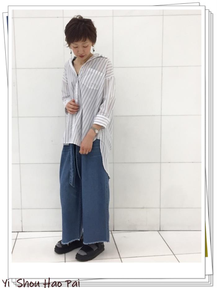 建议轻熟女性使用条纹衬衫作为牛仔阔腿裤的搭配。因为是整洁的单品,所以容易与休闲牛仔阔腿裤组合。