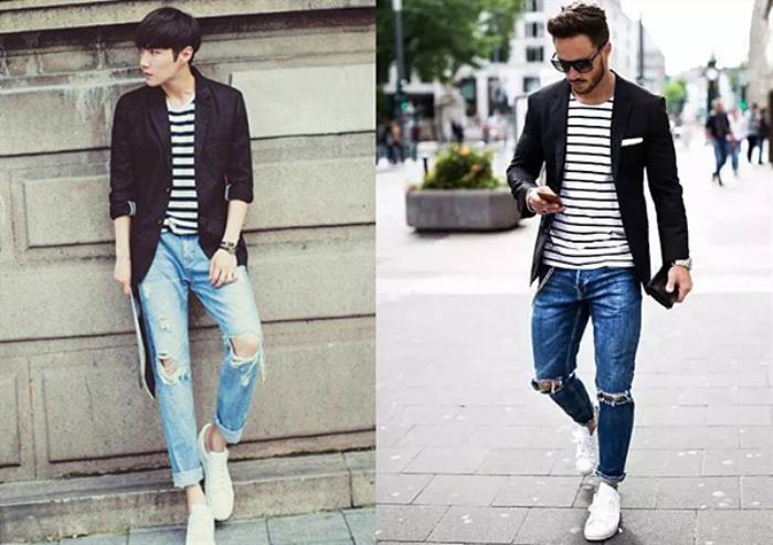 除此之外,上班族在穿破洞牛仔裤的时候,可以搭配条纹T恤,营造出层次感,外面再穿一件西装外套,正式中不失时尚感,让你分分钟成为职场中最靓的仔。