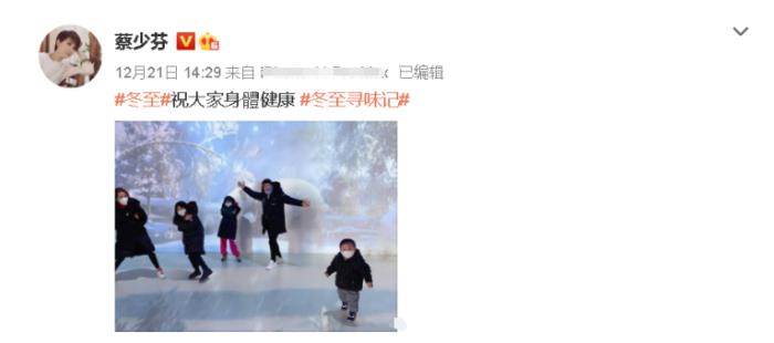 三天前的冬至,蔡少芬发布了长辈和三个孩子玩耍的照片,祝福大家身体健康。