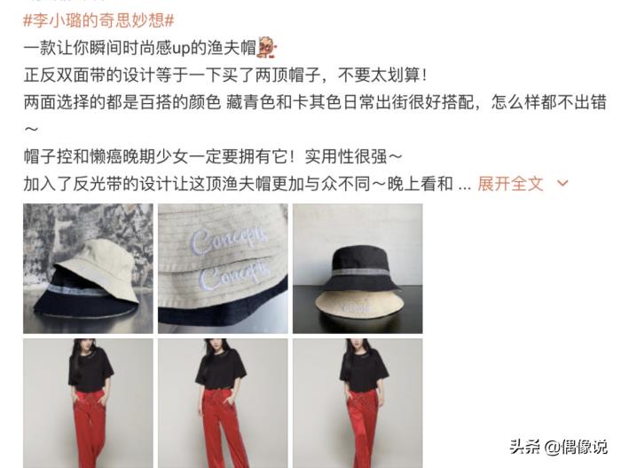 近日,李小璐频繁发博为自家服装品牌做宣传,这是有了新事业吗?李小璐创建新话题“李小璐的奇思妙想”,并在话题里频繁分享自家设计的衣服、帽子等各种服装,而且微博文案基本上就是广告宣传的模式,非常明显地做起了服装方面的事业。