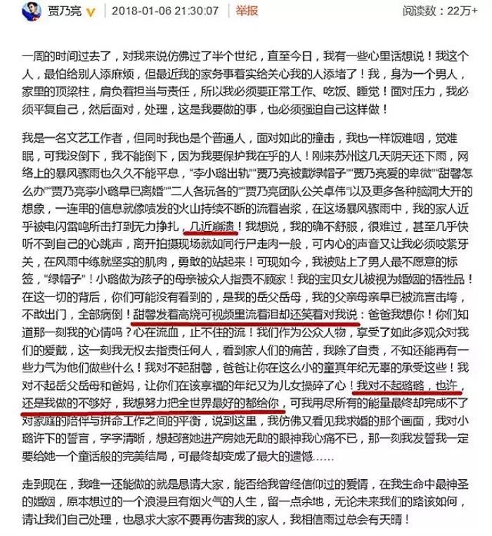 但即便如此,贾乃亮也没有说李小璐一句不好,他在最伤心难过时发的文章中也只是称自己没有做好一位父亲,他还请求网友多给他们一些私人空间,不管这段婚姻最后的结局是什么,请让他们自己处理。