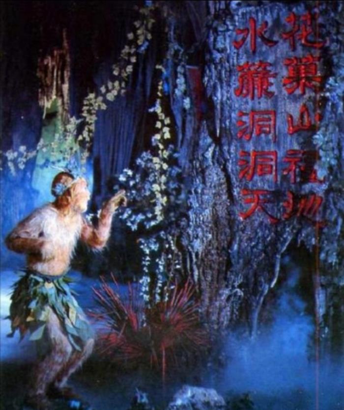 这水帘洞是处在半山腰险崖绝壁上的山洞,因出现金光闪现才引领众猴前往探寻,洞口被水帘遮盖,瀑布飞流直泻而下,飞花溅玉,尤如白虹叠雪,激起千层涌浪。