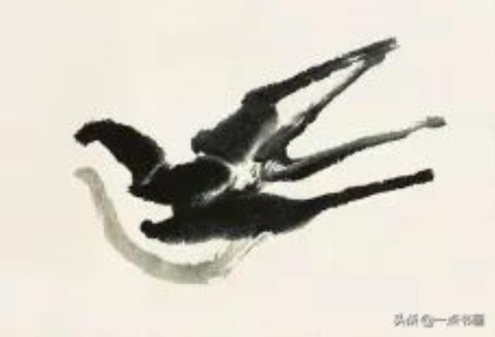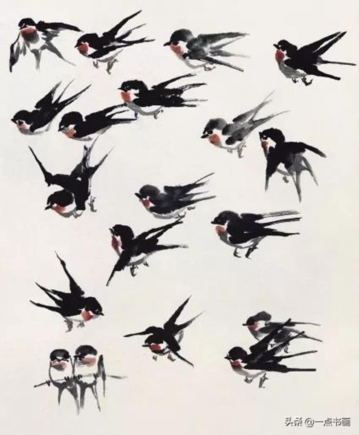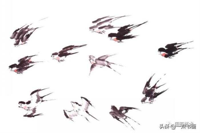 燕子不同的飞翔动态,注意头部、尾部及翅膀的变化关系。在用墨时,切忌翅、背、头三部分连成一片,分辨不出各自的结构与动态。