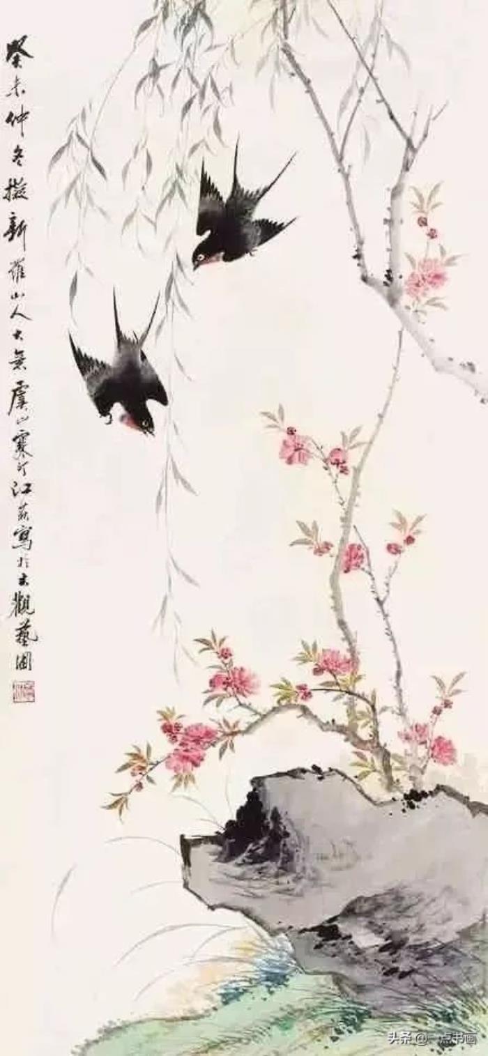 燕子体小翅大,尾长有分叉。头部、背翅、尾部呈黑色,腹白色,嘴短,颈部褐红色。每年春来秋去,是我国常见的候鸟,是画紫藤、桃柳最佳配鸟。