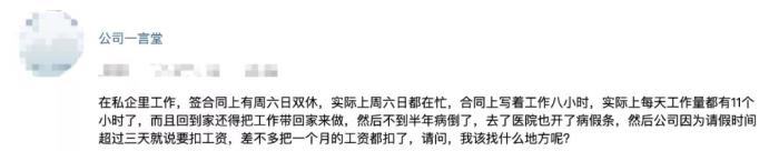 在私企里工作,签合同上有周六日双休,实际上周六日都在忙,合同上写着工作八小时,实际上每天工作量都有11个小时了,而且回到家还得把工作带回家来做,然后不到半年病倒了,去了医院也开了病假条,然后公司因为请假时间超过三天就说要扣工资,差不多把一个月的工资都扣了,请问,我该找什么地方呢?