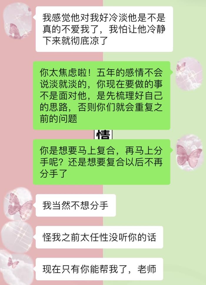 于是第一次他们俩因为结婚问题不欢而散,男生提出了分手把她全线拉黑,准备开始新生活。她分开了3天后后悔了,于是她找到了我,想要我帮忙挽回。我根据她的实际困扰和情况,给她制定了一份复联计划(没错,只是教她如何去复联和合理化,以及在这个时期内好好想清楚关于结婚的问题),结果,这女生很有自己的想法,在对方加回微信后马上跟对方聊得火热,直接跑到对方家里去过夜。第二天很开心地跟我分享,俩人复合了,前前后后距离分手不到7天。