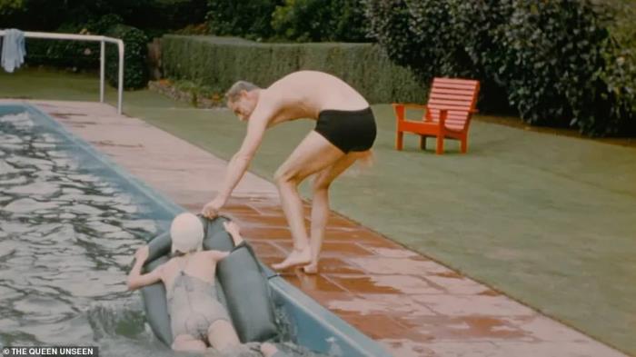菲利普亲王在泳池边带孩子嬉戏,女王为形象着想,并没有下水。
