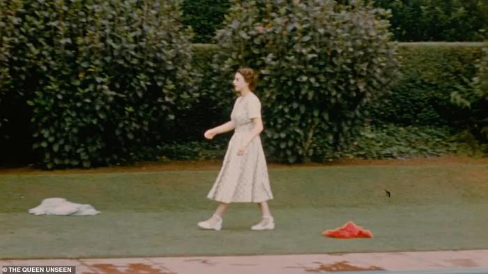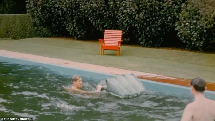 女王夫妻在泳池边休息,菲利普亲王刚刚游泳归来。