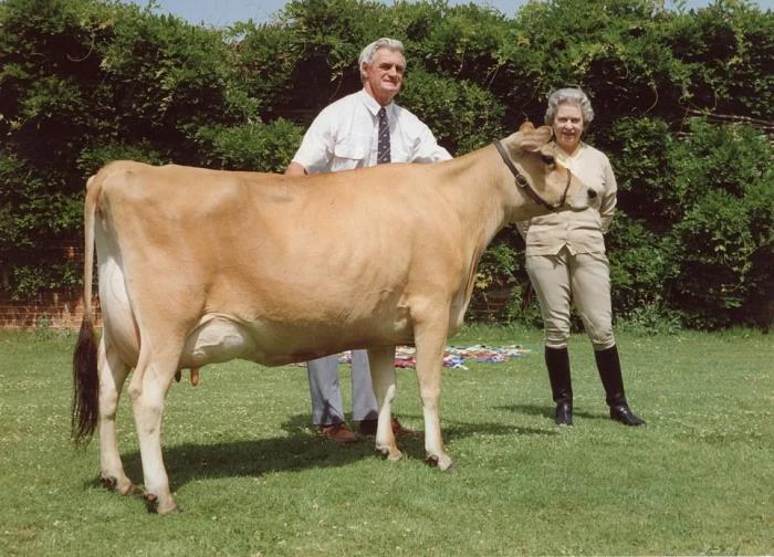 1992年,女王在温莎城堡和一头名叫伊丽莎白的牛合照。女王一向喜爱动物,以养马,牛以及柯基著称。