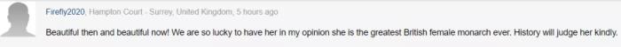 “女王年轻的时候美,现在依旧很美!女王是英国最伟大的女性君王,我们能拥有这样一名君主是多么幸福。历史也将善待她。”
