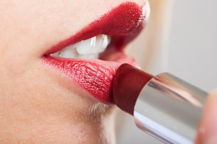 步骤4:最后就到唇妆了,拿出口红或唇膏涂上嘴即可,涂口红建议要竖涂哦!这样更贴合自然。如果你想要让唇妆更显色,可以用适量遮瑕液点涂在嘴唇上,再涂口红或唇膏。