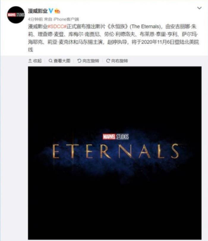 根据漫威影业官方的最新消息,漫威即将推出一部新的作品:《永恒族》(The Eternals)。这部电影计划于2020年11月6日的时候登陆北美院线,中国内地的观众何时能够看到这部电影还是一个未知数。