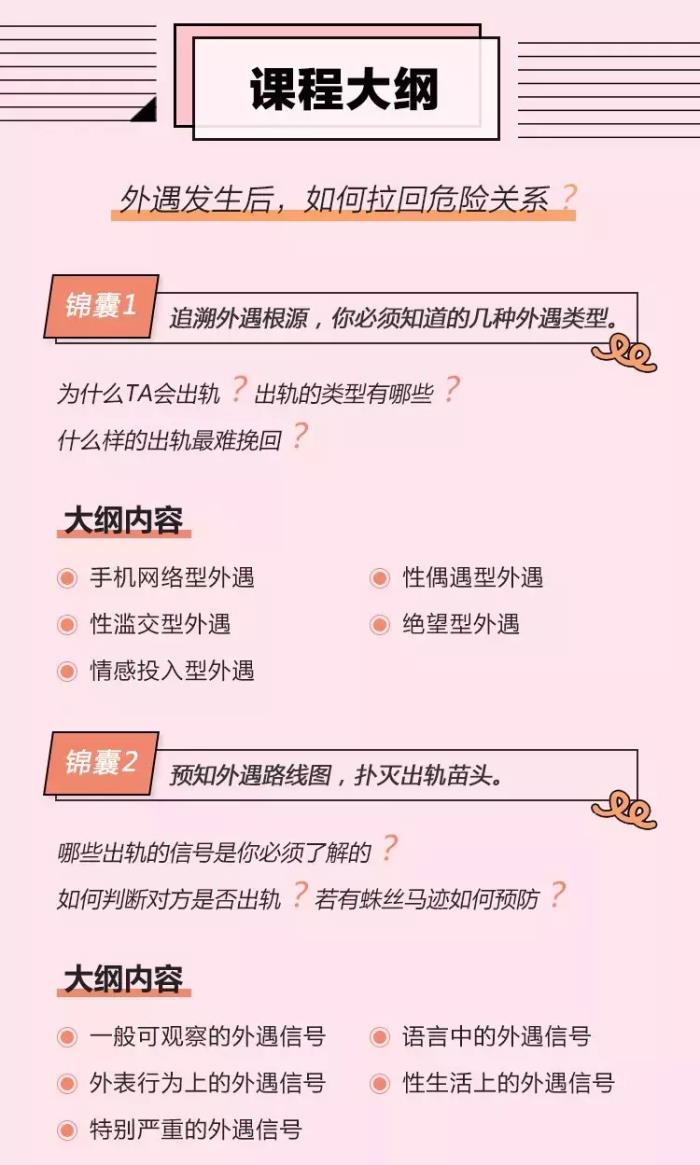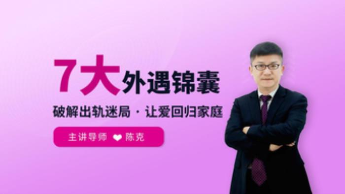 1.遭遇出轨:当你痛苦无助时,陈克老师带你看透婚外情的本质,告诉你什么时候样的婚姻可以坚持,什么样的情况你要放弃。