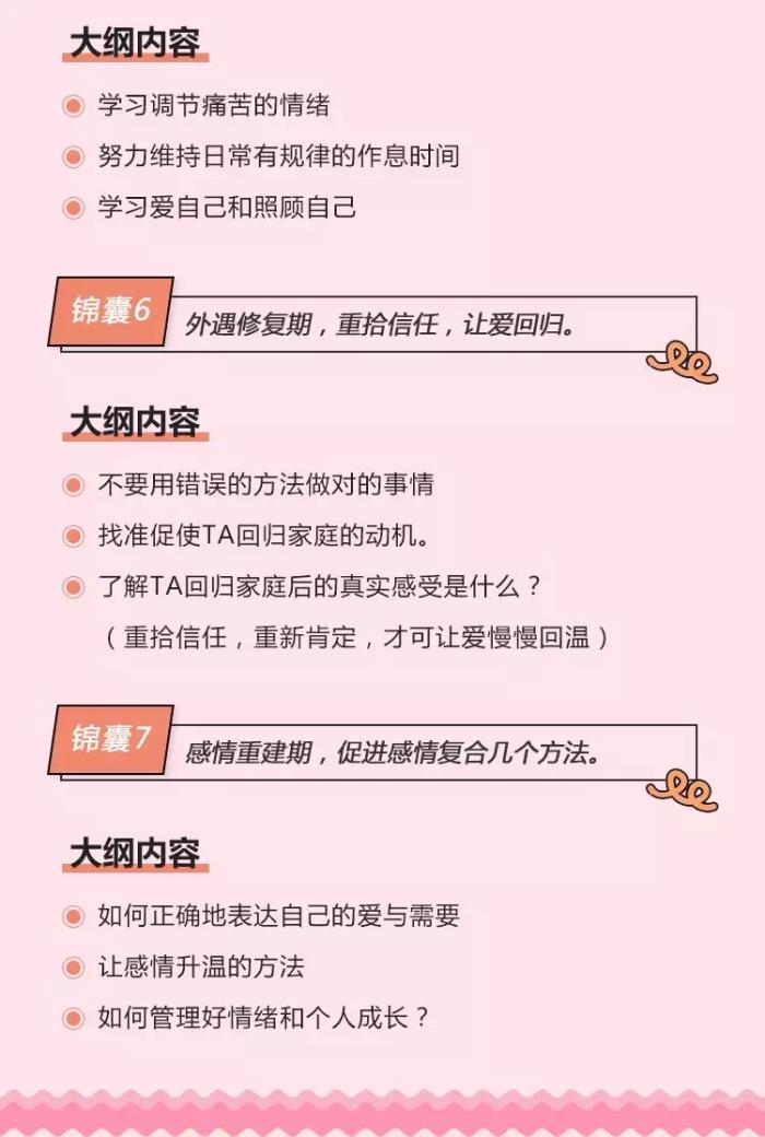 3.挽回修复:当你对修复失去信心时,陈克老师教你正确表达爱和需要,让你不在婚姻中冷场,教你重新信任,重新肯定,让爱慢慢回温。