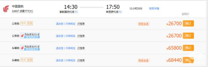国航的淡季两舱,恰好符合了我的刚需时间段。由于去程5折覆盖了12月全月,所以我看着放假的时间,选择了由波音777-300ER执飞的北京-伦敦头等舱。