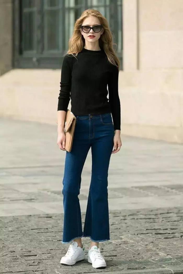 小编个人认为,九分裤的长度对于小个子女生来说是所以喇叭裤中长度最合适的,恰好能够露出腿部线条最细的脚踝位置,所以搭配的小白鞋就要避免高帮的款式,选择低帮的款式更加能够突出脚踝线条,对于身高160左右的妹子来说,搭配九分长度的喇叭裤,适当的露出脚踝显高效果才是最明显的。