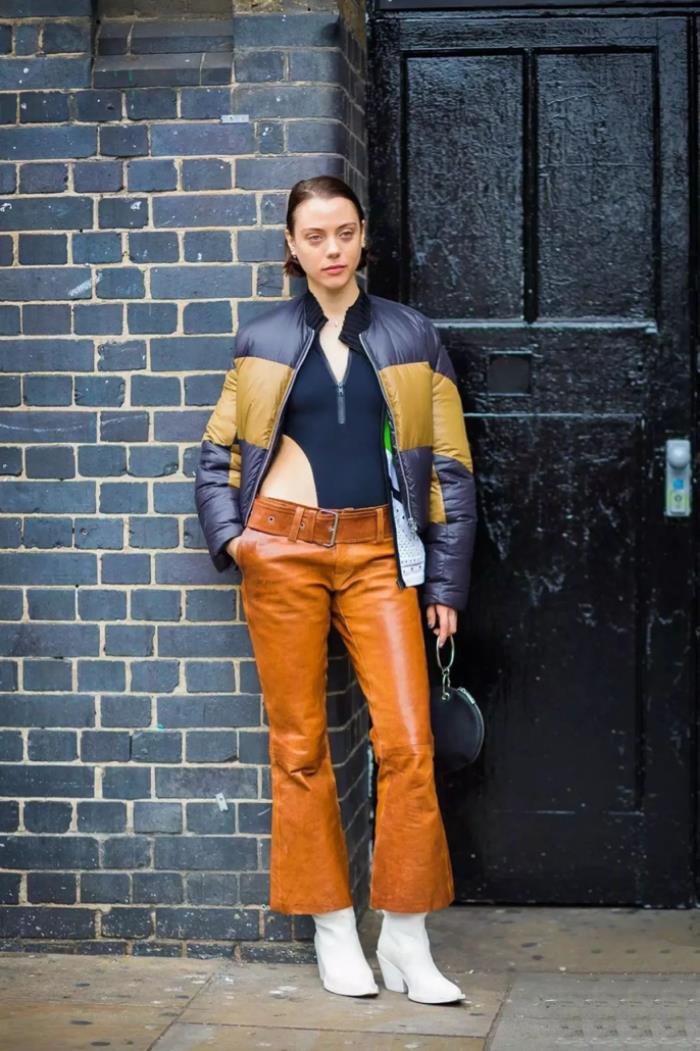 除此以外,一些喇叭裤的裤脚做也都做了新的尝试,夸张复古的裤脚蓬松的视觉线条感,可以衬托的大腿线条更加紧致。或者就是选择有荷叶边拼接的款式,更添少女感。如果可以有适当元素加持的话,喇叭裤即便是黑色款也可以有特殊的时髦气质。