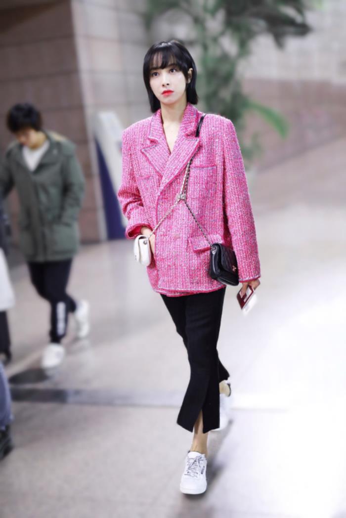 不知道到底好不好看?看看宋茜就知道啦,黑色的喇叭裤搭配小白鞋的方法来打造自己的超长腿线。尤其是喇叭裤裤脚的小开衩设计能够让原本的喇叭裤看起来更加的精致优雅。搭配小白鞋也丝毫不影响整体的身材比例。