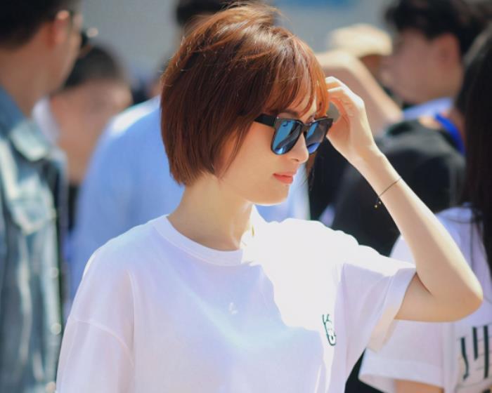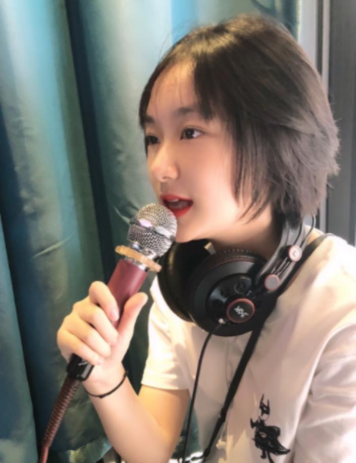 照片中,孙艳身穿一件白色T恤,手里拿着话筒录歌。她一头短发的样子相当清爽,高挺的鼻梁精致的眉眼,满脸的胶原蛋白,再加上大红唇,颜值亮眼。