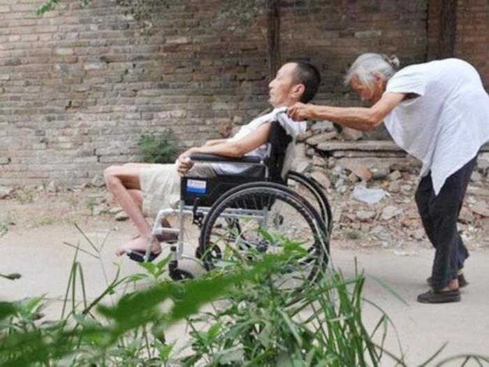 这位老奶奶已经足有九十多岁的高龄了,前些年儿子下身瘫痪,从此无法再行走,而这位老人就成了儿子的双腿,每天都要带着儿子出门遛弯,即使年老体迈,亦弯腰驼背,这位高龄母亲还是为自己的儿子撑起了一片天。