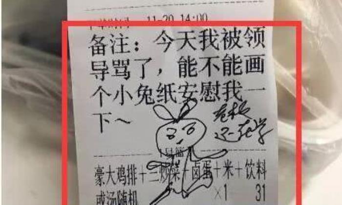 经常有备注让外卖小哥画一个小猪佩奇,小脑斧啥的。这不,外卖小哥都能抢画家的饭碗了,让外卖小哥画个小兔子寻求安慰。能文能武的外卖小哥,佩服佩服!!!