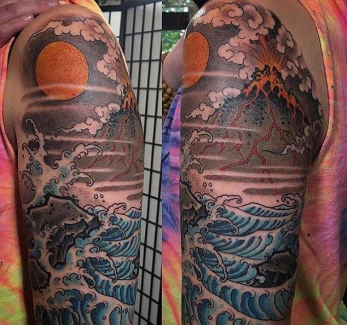 很多人在选择海浪纹身的时候,都会搭配上其他的,比如海浪莲花纹身,海浪鲤鱼纹身,或者是海浪般若纹身等。当然现在用点刺的手法纹海浪纹身的也非常的不错。