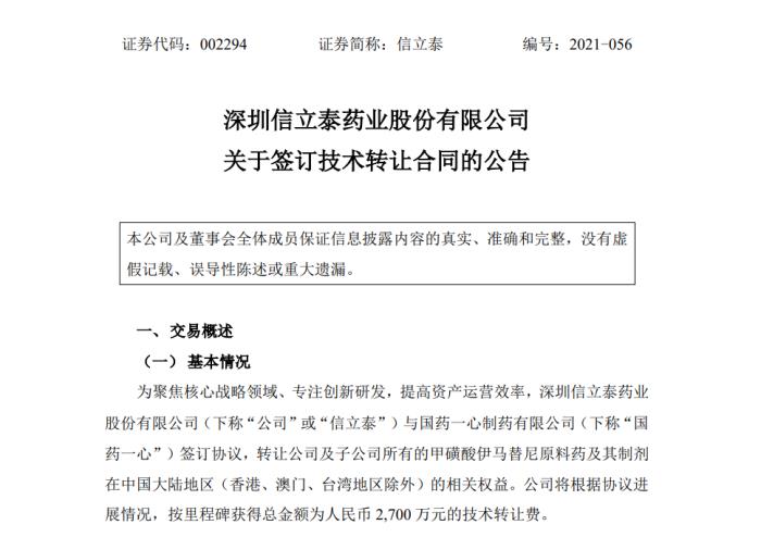 6月22日,信立泰发布公告称,向现代制药的子公司国药一心制药转让甲磺酸伊马替尼原料药及其制剂在中国大陆地区的相关权益。根据双方协议进展情况,信立泰将按里程碑获得2700万元的技术转让费。
