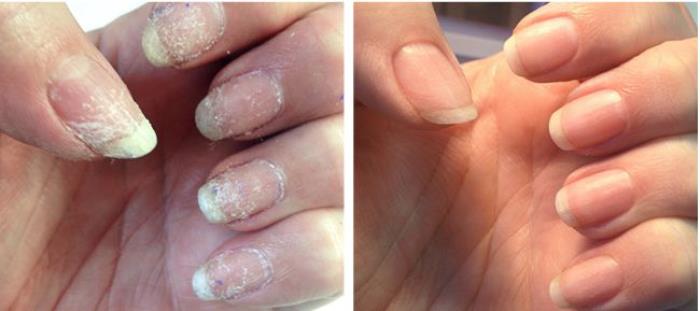 除了改善薄软指甲,NailTek也可以改善厚硬指甲。比如指甲长时间处于失水状态,过分干燥,很容易分层脆裂。