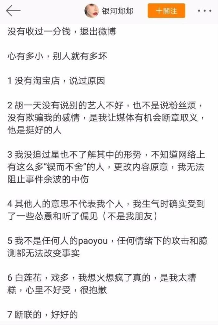 微博名为“银河邶邶”的女主,发长文对“夜会门”事件做出澄清,表示,胡一天没有说过别的艺人不好,是自己找媒体断章取义,又被某些人怂恿才这样做,最后才导致了这样无法挽回的结果。末尾还自黑说自己是“白莲花,就是想火想疯了”,这波替胡一天洗白的操作,让吃瓜群众有点摸不着头脑,难道是自己想通了?