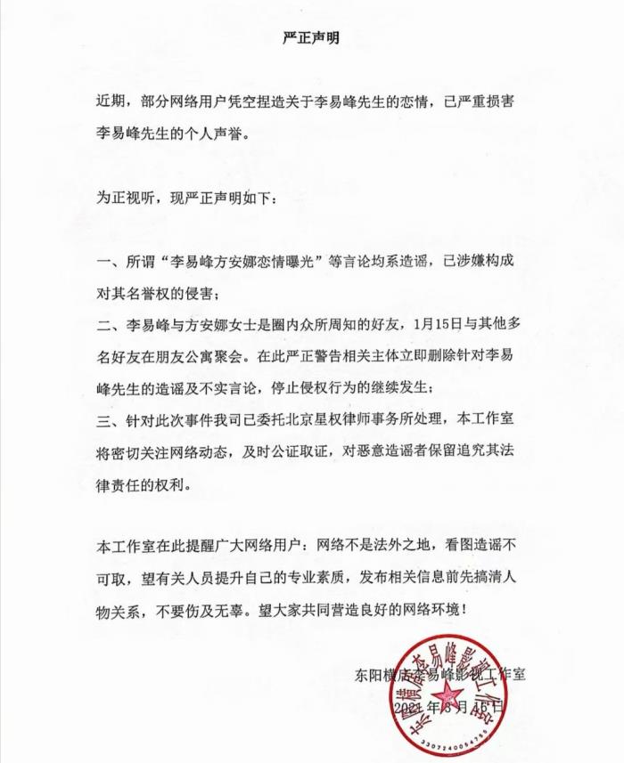 不少网友们看了这视频都表示这是恋爱曝光的节奏吗?要知道李易峰对于恋情这块可是守口如瓶,从这个视频看李易峰真的就像在谈恋爱,所以有媒体向李易峰工作人员求证,想知道事情真假。而对方却表示“如果朋友之间都要造谣生事的话,这种造谣成本是不是也太低了”,直接否认。