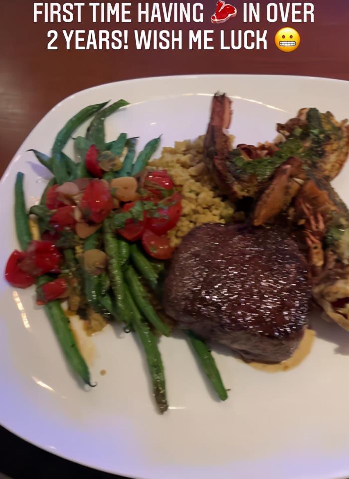 就在今天,詹姆斯在社交媒体上晒出了自己的晚餐,其中有一块是牛排,配文“两年以来第一次吃红肉!祝我好运”很快詹姆斯晒出了自己和爱喝的红酒,称“我会用这个配合食用它!”