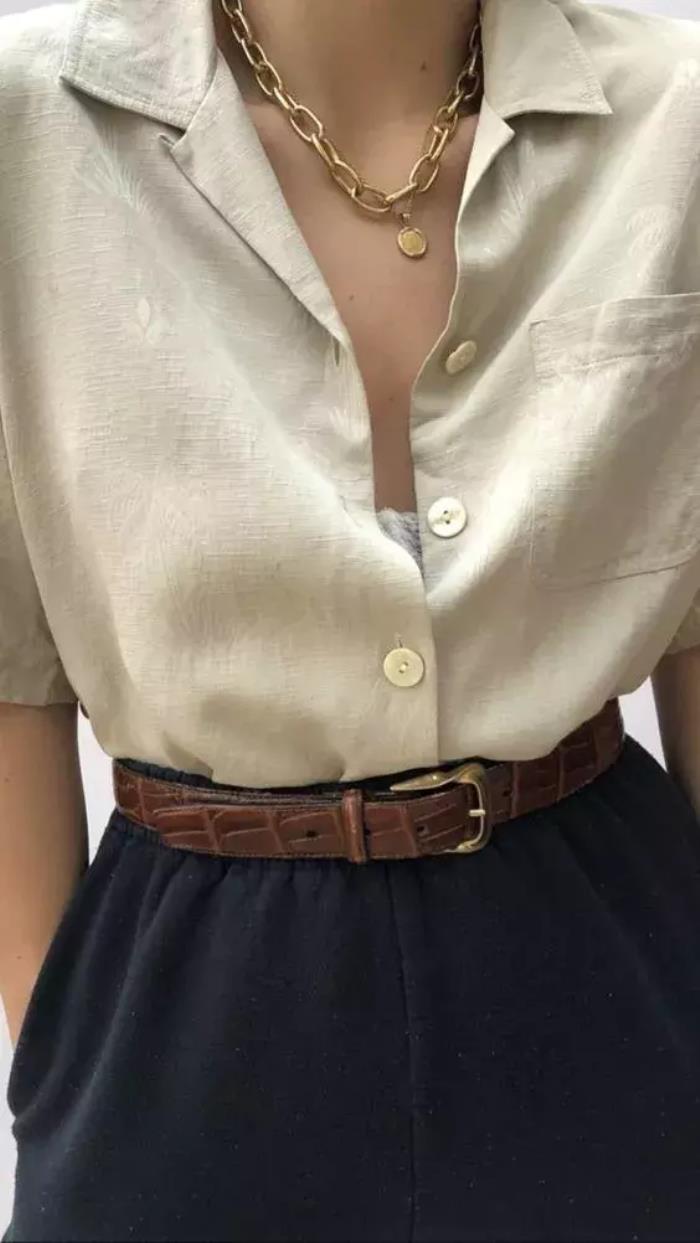 缎面的衬衫稍微容易给人老气感,可以顺势➕一个做旧的金链子,反而会增加一些利落随性的复古感。