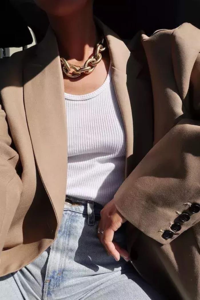 白T+牛仔裤真的没什么特色。但是有了显眼的大金链子,才有认真搭配过的感觉。