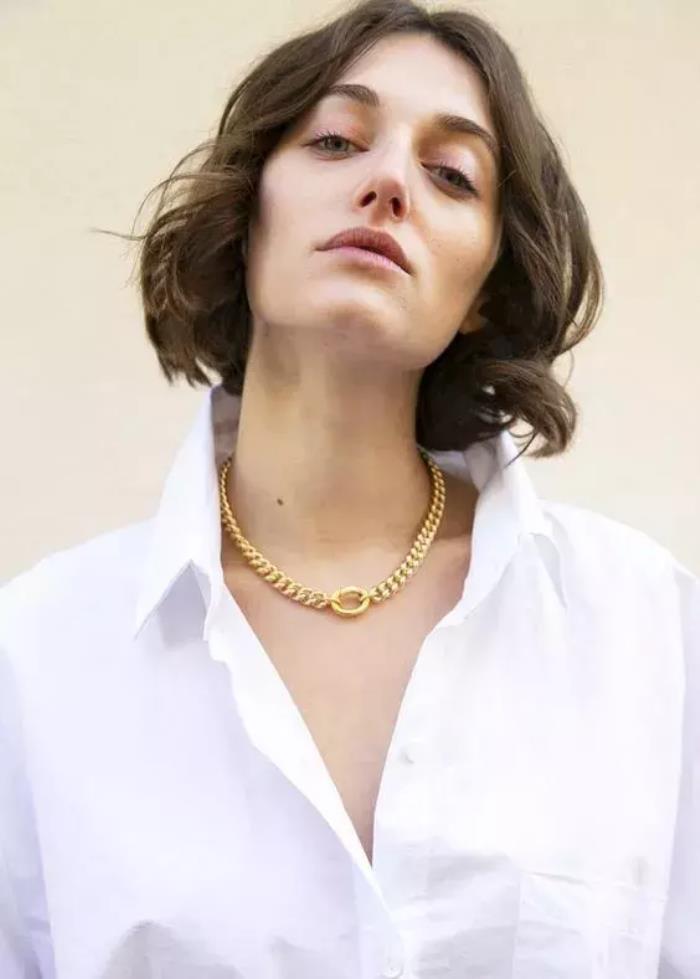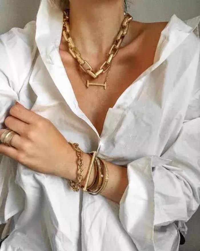 我们觉得最难搞的白衬衫,和大金链子真的很般配。一个容易显得很职场,一个时髦度又很强。两个中和在一起就刚刚好时髦又不夸张。