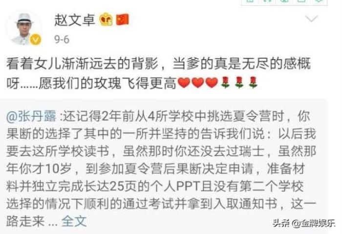 近日,赵文卓的爱人就发文称,小玫瑰在瑞士的学习情况真的是相当不错,除了中文第二,所有课程考试都是排全班第一。要知道,能进到这里的孩子那都是人中龙凤,而且比的不单单是学习成绩,还有各种技能以及体育活动等,这样的水准真的是比李嫣强太多了