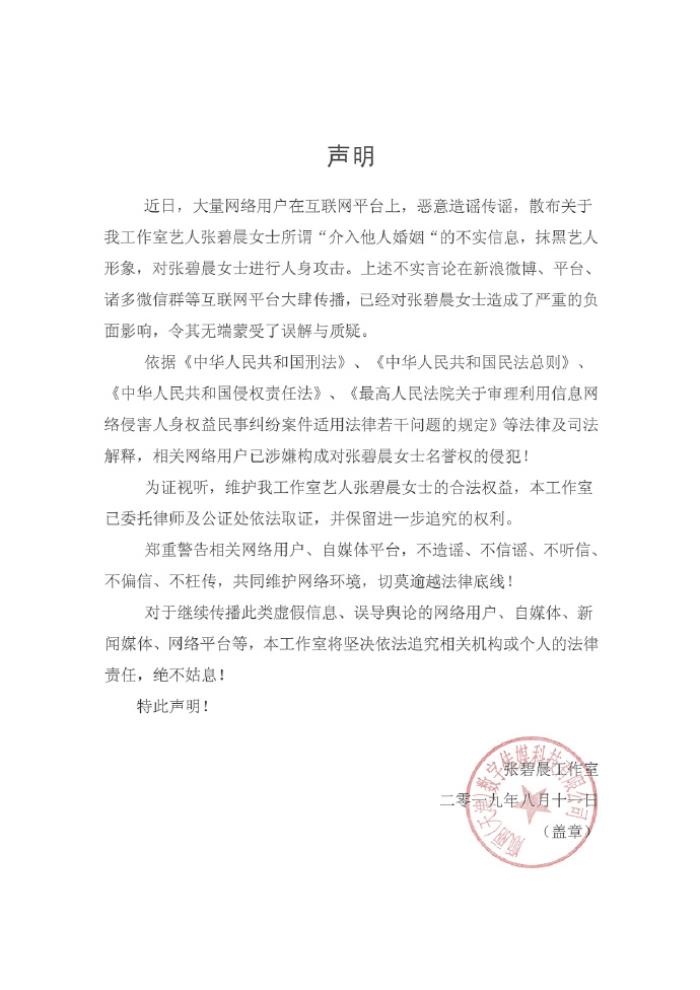 新京报快讯 11日,张碧晨工作室发布声明,称网传张碧晨“介入他人婚姻”系不实信息,已对张碧晨造成严重负面影响。以下为声明全文: