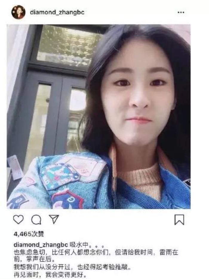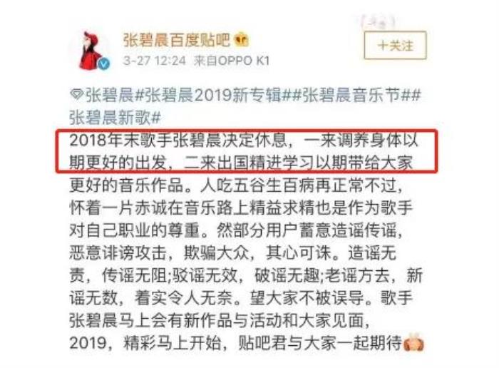 2019年3月1日,张碧晨在经过几个月的空白行程后发布想要工作的状态,她说“比任何人都想念你们,但请给我时间,再见面,我会变得更好”。3月17日,张碧晨发文称马上就要回国。