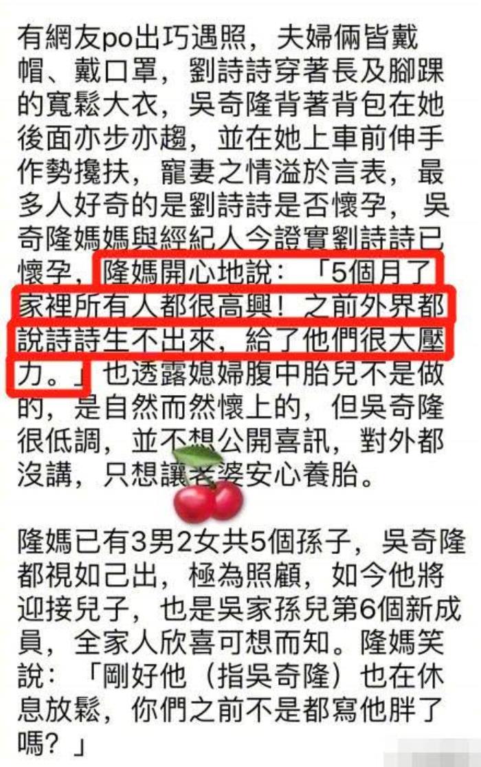 重点就是在吴奇隆刘诗诗本尊出面回应之前,吴奇隆妈妈先出来接受了采访,确认已经怀孕五个月,还说“之前外界都说诗诗生不出来,给了他们很大压力”。