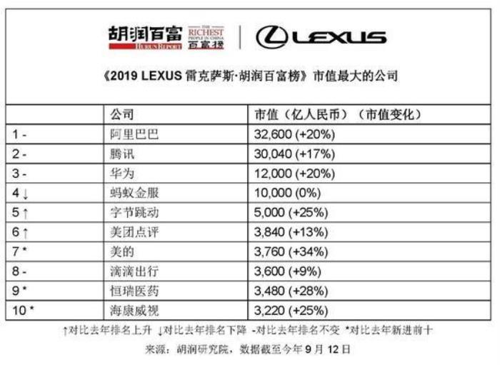 从榜单上我们发现,阿里巴巴和腾讯占据了冠亚宝座。阿里巴巴和腾讯是今年榜单上市值最大的公司,都超过3万亿人民币。去年位列前十大市值最大的公司的百度、小米和恒大,今年跌出前十。