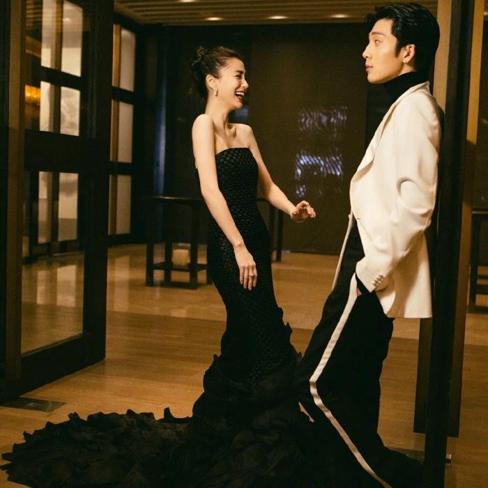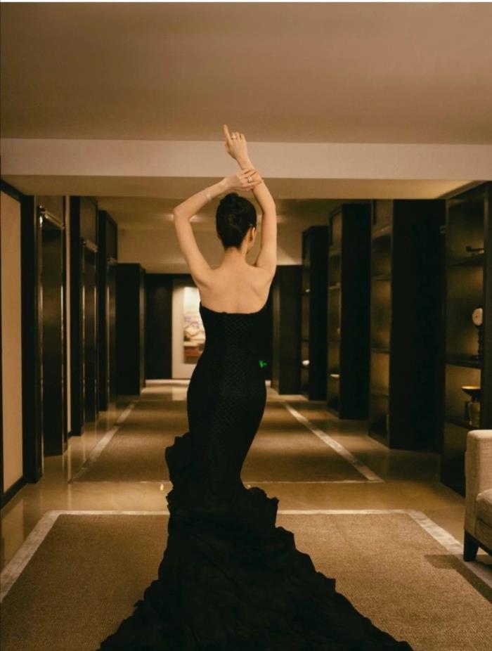 杨颖的身材本就非常纤瘦,一件黑色的修身礼服又非常显瘦,看着侧面的效果真的是太“薄”了。面料的纹理灯光下的效果更加精致,看着有些像鱼鳞的感觉,鱼尾裙的造型简直就是人鱼公主。