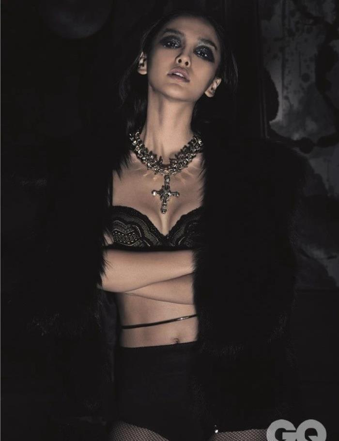 杨颖拍摄的还有这身造型,相比之下这身造型虽然也有些暴露但是看着更有高级感,黑色的皮草披肩尽显雍容华贵,内里一件黑色蕾丝文胸非常性感,下装的搭配也非常性感,网格蕾丝裤袜性感而不低俗。杨颖的这身造型搭配的项链设计夸张气质非常霸气。杨颖的这身造型同样是烟熏妆,这妆真的是太重了,看着有些像《疯狂动物城》里的大先生。
