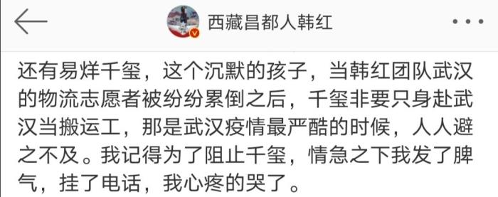 韩红在文中提及:“这是个沉默的孩子,当韩红团队武汉物流志愿者被纷纷累倒后,千玺非要只身赴武汉当搬运工,那是武汉疫情最严酷的时候,人人都避之不及。我记得为了阻止千玺,情急之下,我发了脾气,挂了电话,我心疼的哭了......