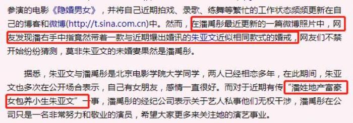 两人在一起之后还被传出了“潘姓地产富豪女包养小生朱亚文”一事。