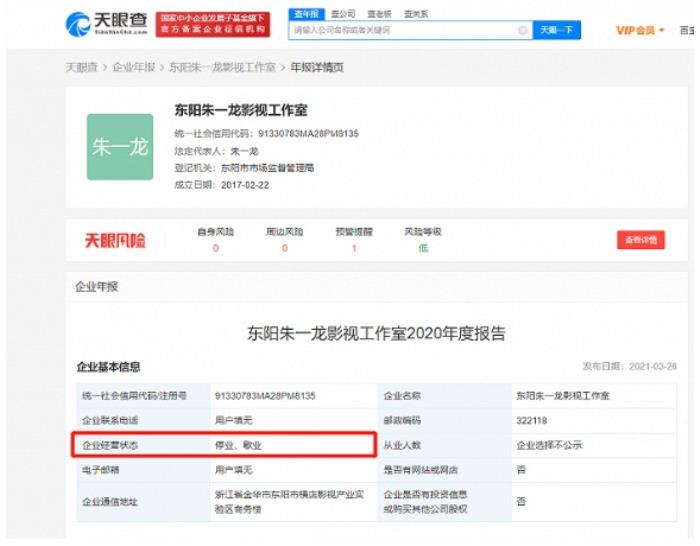据天眼查App显示,近日,东阳朱一龙影视工作室发布2020年度报告,企业经营状态显示为停业、歇业。
