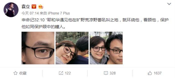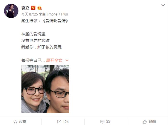 3月29日7点14分,袁立首次在微博上晒出老公梁太平的正面照。随后又贴出老公的一首情诗《爱情啊爱情》,在回复网友留言“准是这些诗把渴望爱情的小月拿住了”时,承认的确如此,并表示:“诗歌关乎灵性!让我们把眼目从金钱,宴乐、各种成功.......回复到诗歌的年代!要不人类太干涸无聊了!”