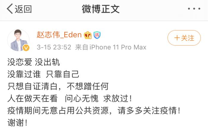 3月15日晚,赵志伟在社交平台发文:没恋爱没出轨,问心无愧。否认与虞书欣恋爱关系,并表示不想蹭热度。