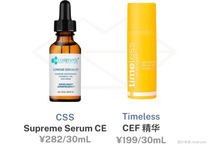 CSS 和 Timeless 还是要提一下的,配方上可以说非常接近修丽可 CE 精华了,而且也有纯VC 精华。
