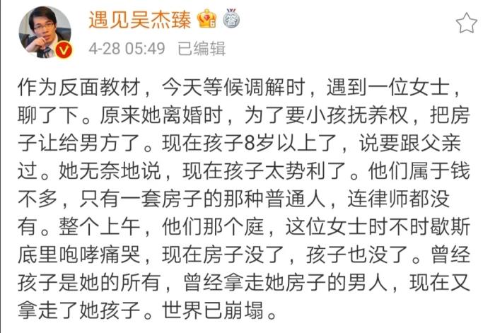 这名妈妈是一个普通的家庭,只有一套房子,一个孩子。离婚的时候,连律师都请不起。