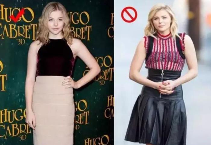 Y型身材上宽下窄,所以要适当描形、加宽下半身的廓形,平衡身材的比例。如下图,直筒下装,直接暴露了上身宽广的缺点,并且会衬得肩部更加突兀。梯形下装则很好地弥补了下身的缺失,使得上下协调、比例非常和谐。